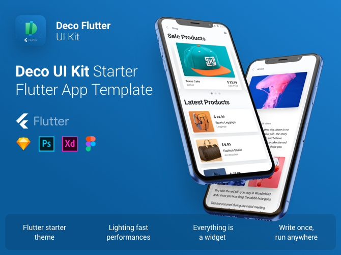 Flutter Deco UI Kit includes well-documented and easy to use widgets ready to be added into your app. These widgets deliver on both Android and iOS.